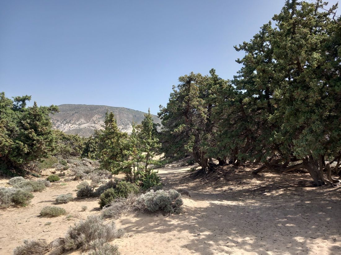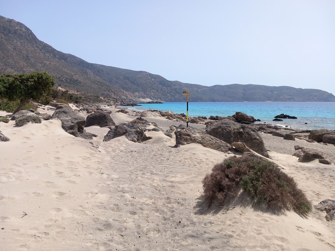 A little further towards Paleochora is another beautiful beach, Kedrodasos, which means cedar forest. It's two kilometers along the E4 long-distance hiking trail, but it's a tough two kilometers with lots of climbing over rocks. The E 4, I realize every time, is not a walk through a park. Kedrodasos is a dune beach with cedars and lots of junipers, very beautiful to look at, but not as ideal for swimming as its famous sister, Elafonisi, because of the rock slabs in the water.