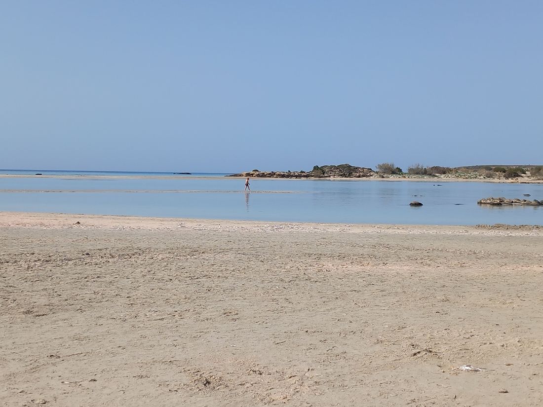 The next day, we take a trip to the lagoon beach of Elafonisi, which is considered one of the most beautiful beaches in the world. Thousands of visitors are there in the season, but on this early April morning we have the dream beach with the pink sand almost to ourselves. And: there's no wind, the water is completely smooth, it's beautiful.